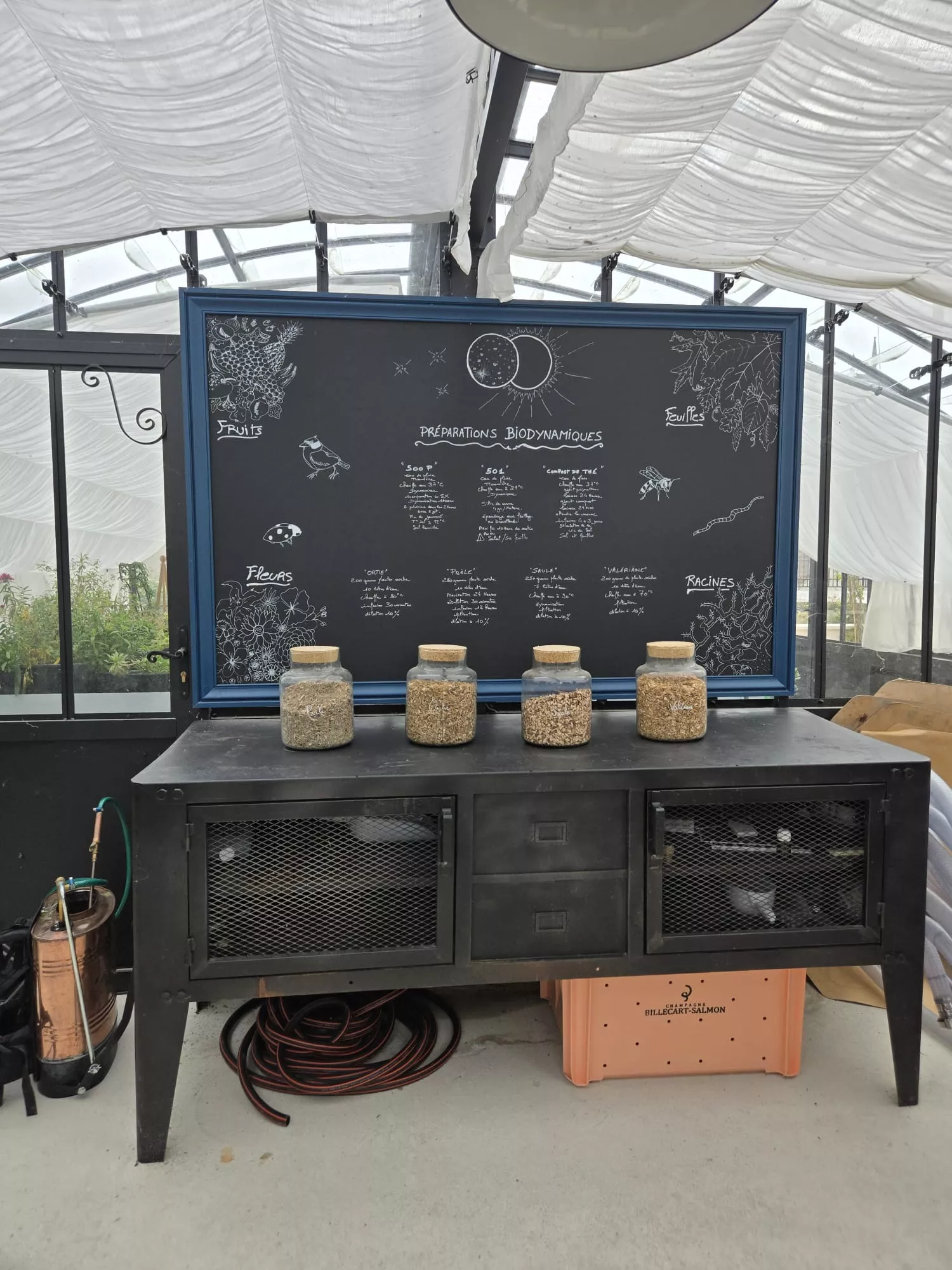 Un récupérateur d'eau à la mesure du lieu, une serre pour faire les décoctions nécessaires à la vigne (la recette au tableau)